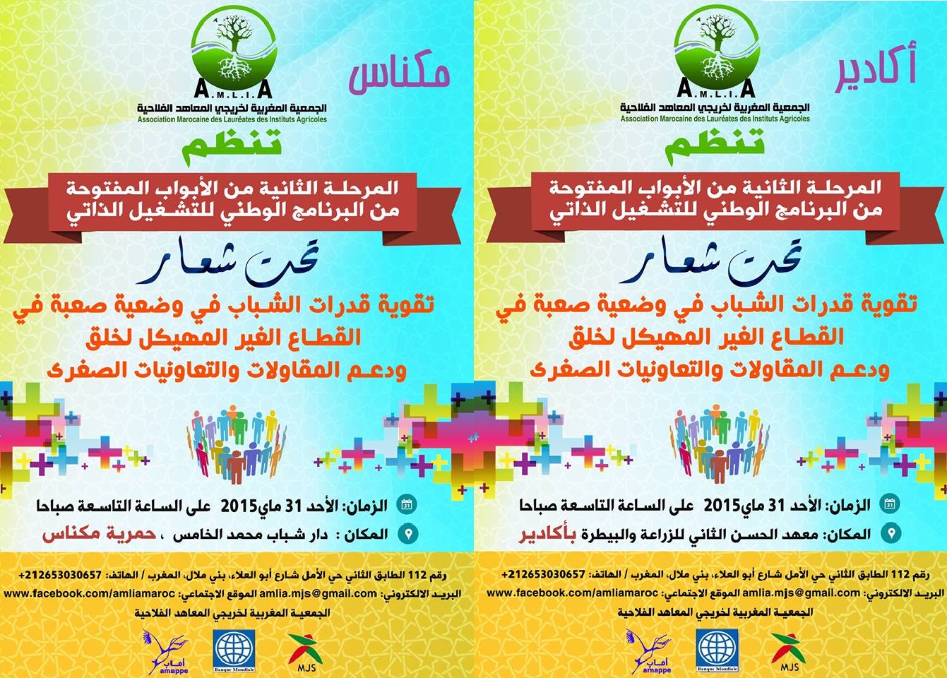 في إطار تنزيل مخططتها الإستراتجي وتفعيل البرنامج السنوي تعلن الجمعية المغربية لخريجي المعاهد الفلاحية كافة خريجي المعاهد الفلاحية بكل من جهة سوس ماسة وجهة مكناس تافيلات والمهتمين بفكرة إنشاء التعاونية الفلاحية والتشغيل الداتي إلى حضور اللقاء الثاني للبرنامج الوطني للتشغيل الذاتي الذي تشرف عليه وزارة الشباب والرياضة بدعم من البنك الدولي و بشراكة مع الجمعية المغربية لدعم تنمية المقاولة الصغرى; والذي يهدف إلى دعم قدرات الشباب الذين تتراوح أعمارهم بين 18 و 30 سنة في وضعية صعبة في القطاع غير المهيكل لخلق و دعم المقاولات و التعاونيات الصغرى،