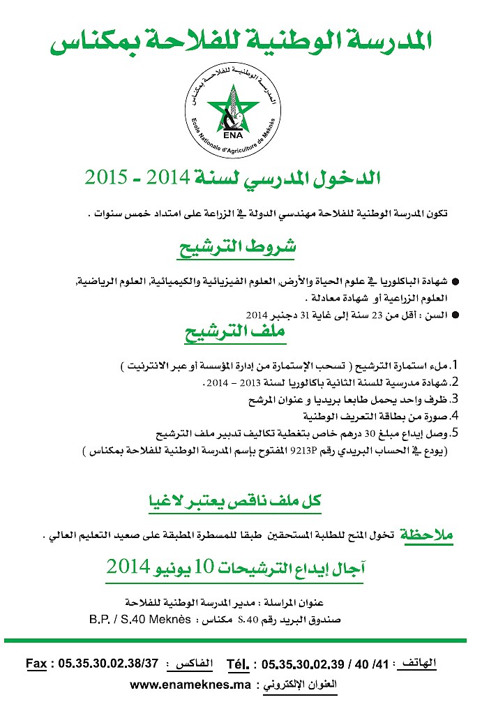 التسجيل بالمدرسة الوطنية للفلاحة بمكناس لموسم 2014-2015
