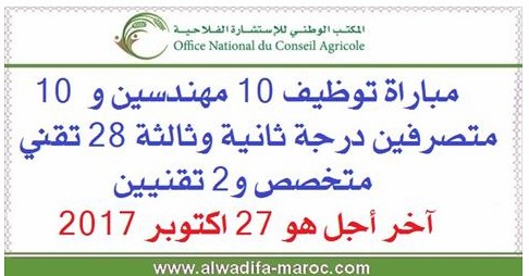 ينظم المكتب الوطني للاستشارة الفلاحيةلا ابتداء من يومي 18 و19 نونبر 2017، بالرباط، خمس مباريات لتوظيف: