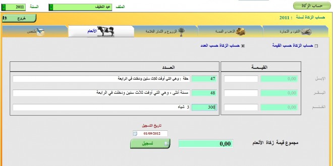 يمكن البرنامج حساب الزكاة في النقد والذهب والفضة وعروض التجارة والزروع والثمار و الأنعام