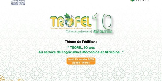 يتجدد لقاء الفاعلين والمهنيين المغاربة والاجانب المهتمين بالقطاع الفلاحي بمدينة اكادير في إطار فعاليات الدورة 10 للجائزة الوطنية للخضر والفواكه تروفيل 2019، التي تعد موعدا سنويا لتبادل الخبرات والتجارب في القطاع الفلاحي، دورة هذه السنة اختير لها كشعار: تروفيل 10 سنوات في خدمة القطاع الفلاحي المغربي والافريقي.