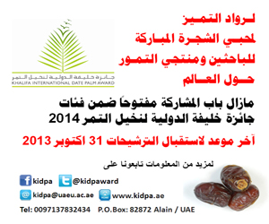 آفاق بيئية : تفيد الأمانة العامة لجائزة خليفة الدولية لنخيل التمر، أن الترشح واستلام طلبات التقدم لجائزة خليفة الدولية لنخيل التمر لعام 2014 بمختلف فئاتها في دورتها السادسة مفتوحا أمام الباحثين والمتخصصين والمهتمين بشجرة نخيل التمر والتقنيات الخاصة بها، إلى غاية 30اكتوبر 2013.