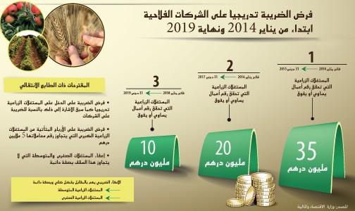 اقترح مشروع قانون المالية لسنة 2014 ،الذي قدم محمد بوسعيد وزير الاقتصاد والمالية خطوطه العريضة أمام غرفتي البرلمان ، فرض الضريبة تدريجيا على الشركات الفلاحية والتي تشمل ابتداء من يناير المقبل الشركات الكبرى التي تحقق رقم معاملات يفوق 5 ملايين درهم. وبحسب المذكرة التقديمية لهذا المشروع، فإن الإعفاء الضريبي يهم بالمقابل بشكل كلي وبصفة دائمة المستغلات الزراعية الصغرى والمتوسطة والنشاطات الأخرى ذات الطابع الزراعي التي يكون رقم معاملاتها السنوي يقل عن 5 ملايين درهم.