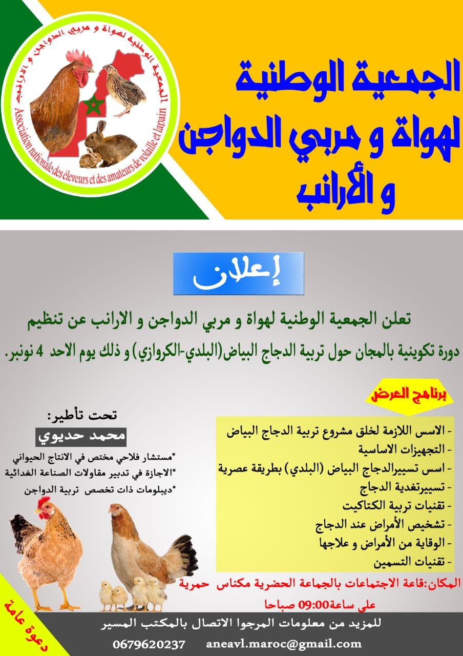 تستعد الجمعية الوطنية لهواة و مربي الدواجن و الارانب و تحت اشراف المكتب المسير الذي اخذ على عاتقه تنظيم اول دورة تكوينية بمدينة مكناس كمحطة اولى حول موضوع اسس تربية الدجاج البياض (البلدي -الهجين) لفائدة المنخرطين بالجمعية كما ان الدعوة مفتوحة لعموم مربي و هواة تربية الدواجن خاصة المبتدئين في هذا المجال و ذلك من اجل التعرف على اسس انجاح مشروع تربية الدواجن من خلال برنامج عرض الدورة التكوينية الذي سيلقيه السيد حديوي محمد مستشار فلاحي مختص في الانتاج الحيواني .
