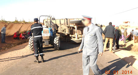 تعرض يوم الخميس 02/01/2014مجموعة من العمـــــــــال و العاملات الزراعيين لحادث انقلاب مقطورة مجرورة بجرار تحمل ازيد من 40 عاملا و عاملة زراعية على الطريق بايت عميرة حوالي 14 ه 45 بعد الزوال ،قادمة من ضيعة شركة “زنيبر” الفلاحية ،وقد عاين أعضاء الجمعية المغربية لحقوق الانسان منذ بدايات الحادث الى وقت تقديم الاسعافات و التدخلات الاستعجالية بالمستشفى الاقليمي المختار السوسي بيوكرى،اذ تم تسجيل 36 حالة زارت المستشفى الاقليمي ،من بينها 16 عاملة زراعية،20 عامل زراعي،ومن بينهم 5 متدربات و متدربين،كما تم تسجيل 6 حالات تم نقلهم الى المستشفى الجهوي الحسن الثاني قصد استكمال العلاجات الضرورية.و الجدير بالذكر أن هذا الحادث ليس الاول من نوعه الذي يسجل بالمنطقة،رغم الدعوات المتكررة لتحسين شروط نقل العاملات و العمال في ظروف تحترم كرامة و انسانية هؤلاء العمال/ت، التي يذهب ضحيتها العديد دون احترام قوانين الشغل و التامين و العبث بأرواحهم من اجل حماية مصالح الشركة التي تراكم الاموال الطائلة من عرق و كد الطبقة العاملة،دون الالتفات الى أوضاعهم المعيشية المزرية.