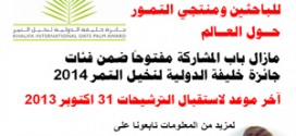 آفاق بيئية : تفيد الأمانة العامة لجائزة خليفة الدولية لنخيل التمر، أن الترشح واستلام طلبات التقدم لجائزة خليفة الدولية لنخيل التمر لعام 2014 بمختلف فئاتها في دورتها السادسة مفتوحا أمام الباحثين والمتخصصين والمهتمين بشجرة نخيل التمر والتقنيات الخاصة بها، إلى غاية 30اكتوبر 2013. وتتشكل فئات جائزة خليفة الدولية لنخيل التمر من: فئة البحوث والدراسات المتميزة في مجال صناعة النخيل بصفة …